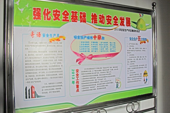 按照2013年“安全生產月”活動實施方案要求,公司所屬各單位張貼、懸掛安全生產警示語,突出宣傳“強化安全基礎,推動安全發展”的活動主題。