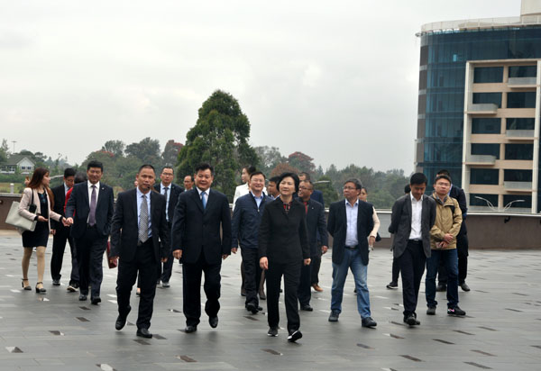 訪問團一行首先參觀了雙河商貿中心,對雙河項目給予了充分肯定。座談期間,公司董事長王元旦及江西國際、江西中煤等駐肯企業代表逐一就企業在肯尼亞的發展情況進行匯報。馮桃蓮主任充分贊揚了江西企業在肯尼亞的各項優秀業績,同時指出,在省委、省政府的正確領導下,希望各駐肯企業能夠緊密合作、抱團發展,加強安全管控,提升企業抗風險能力,樹立良好的企業形象。