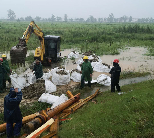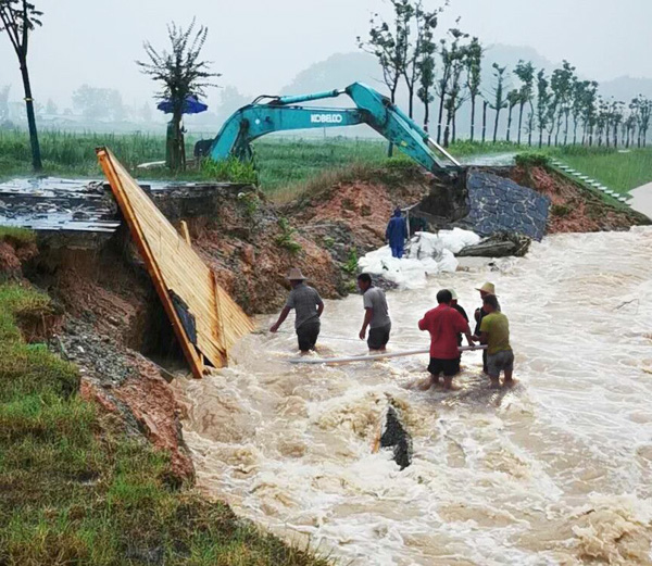 進入7月以來,昌江河流域普降暴雨,橋溪水河水位大漲。7月7日,公司接到業(yè)主汛情通報,已完工驗收工程多處出現(xiàn)險情;汛情就是命令,時間就是生命,公司迅速組建了一支裝備精良、經驗豐富的專業(yè)搶險突擊隊,由副總經理曾朝文、總經理助理杜凌帶隊,連夜奔赴浮梁抗洪一線,組織設備、人員、材料進場,進行搶險救災工作。